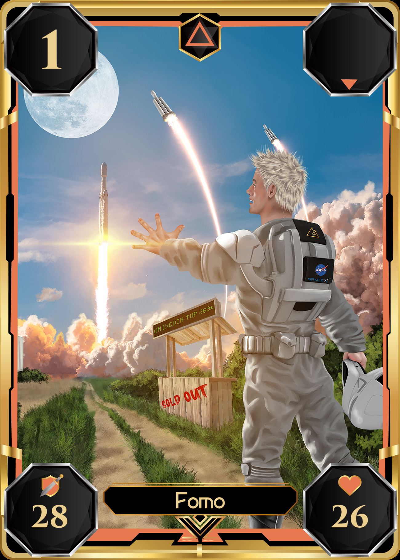 When the news arrives on the next cryptocurrency to rocket to the moon, Fomo arrives late to the party. Fear of missing out starts to kick in and he makes a last ditch attempt to board the ship with the chance of taking a seat. Fomo will resort to any means necessary to combat Fud and encourage investors to change positions.