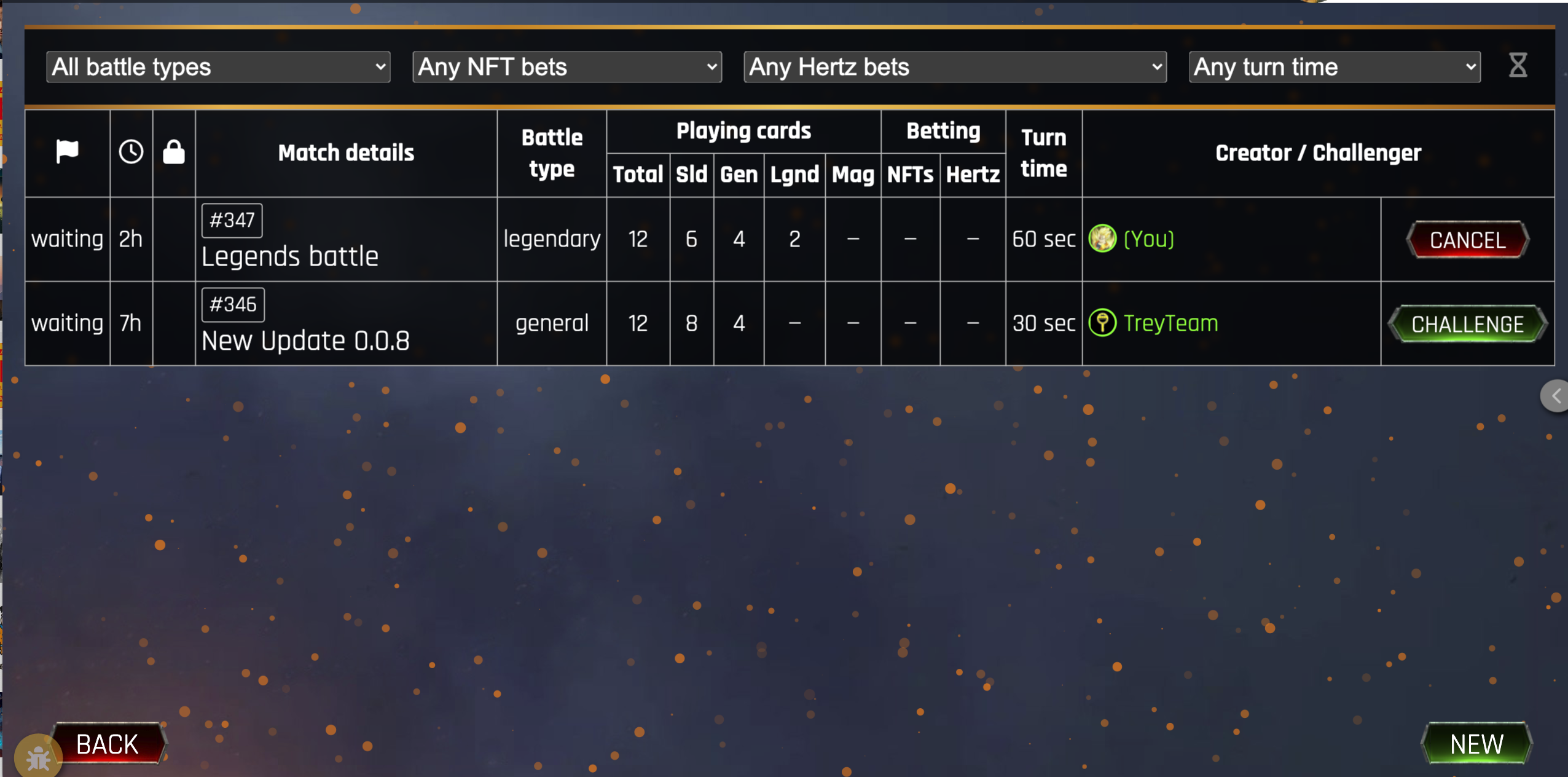 The small flaw here is that the "challenge" button shouldn't be visible (or should be disabled) when you have any battle created and waiting for challengers.