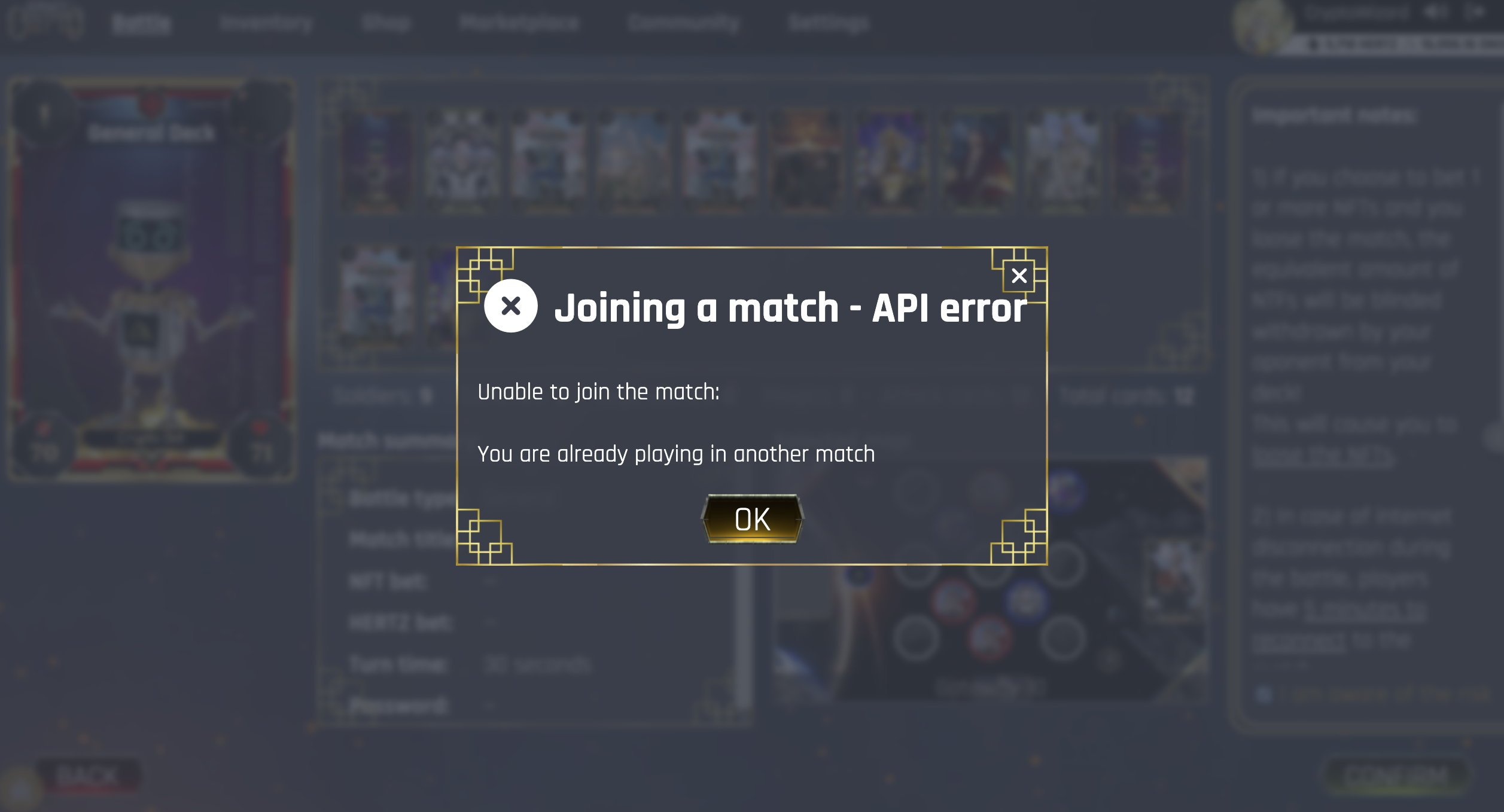 I had first created a battle expecting someone to join me. Then I decided to join someone's battle, but I got a message saying that I was already playing in another match. I suggest when that happens, the match created by me gets cancel automatic and I'm able to join my opponent's match.