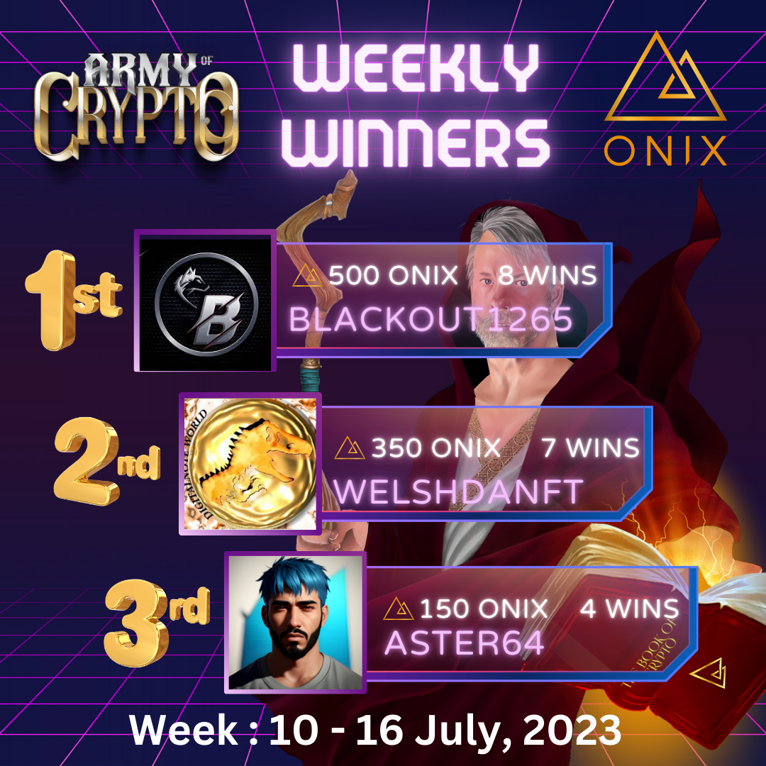 We also want to extend our congratulations to Welshdanft for their remarkable performance, securing 7 wins and securing second place! You will be receiving 350 $ONIX as a token of recognition for your dedication and skill. Great job!