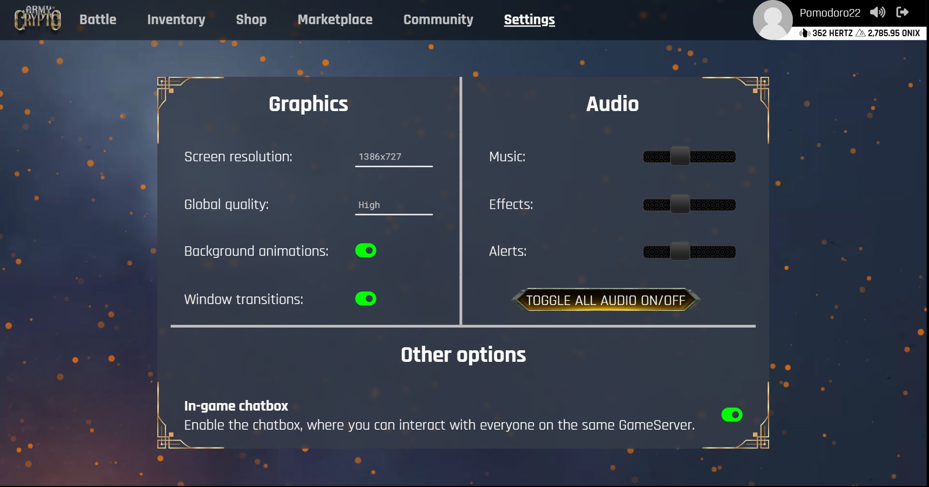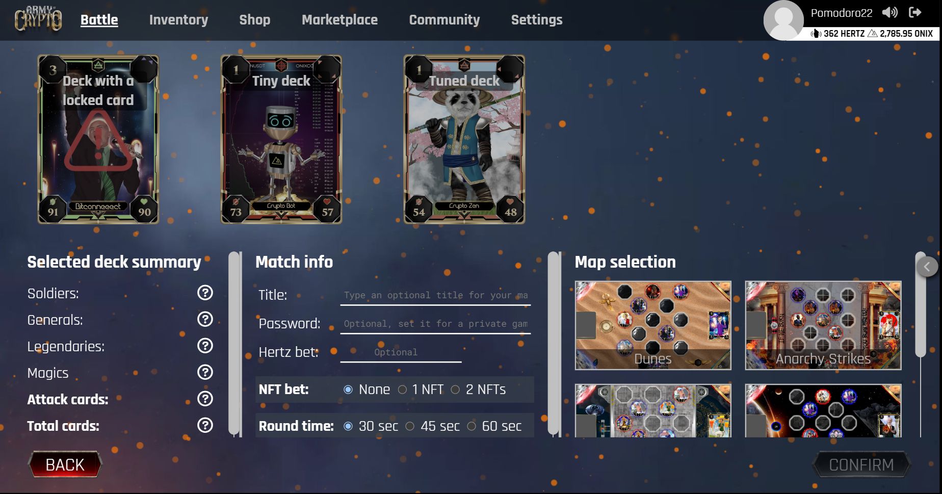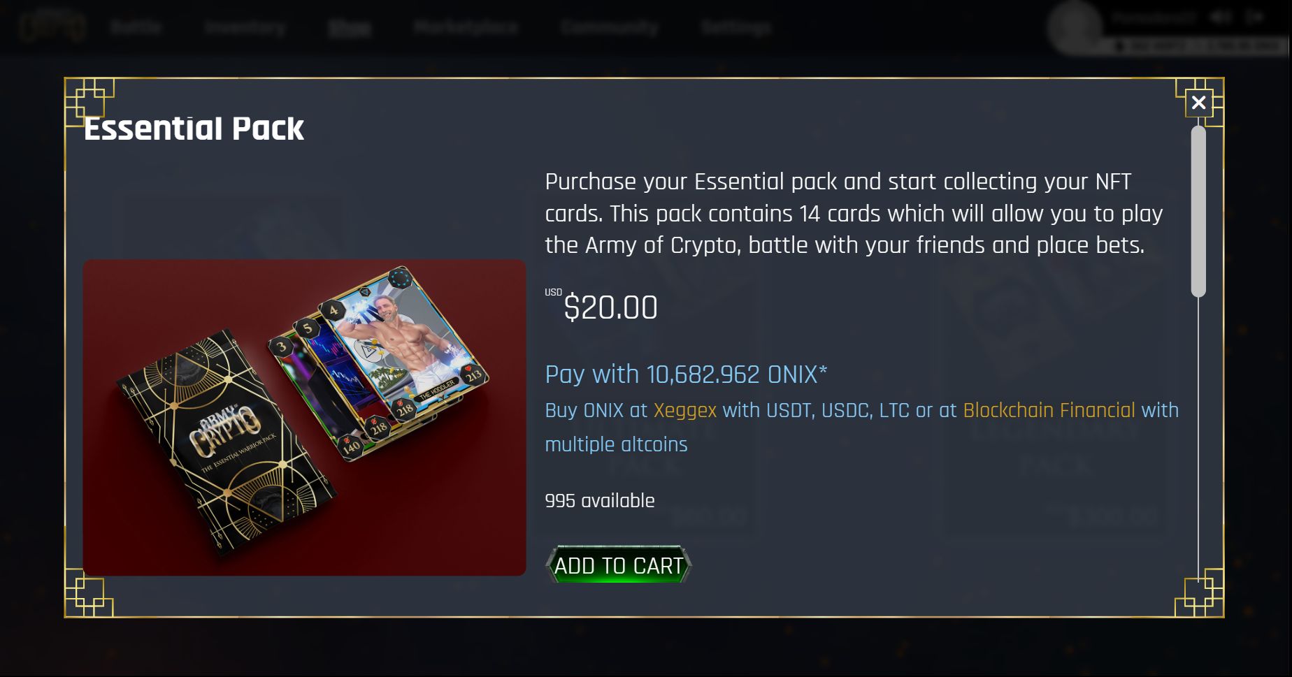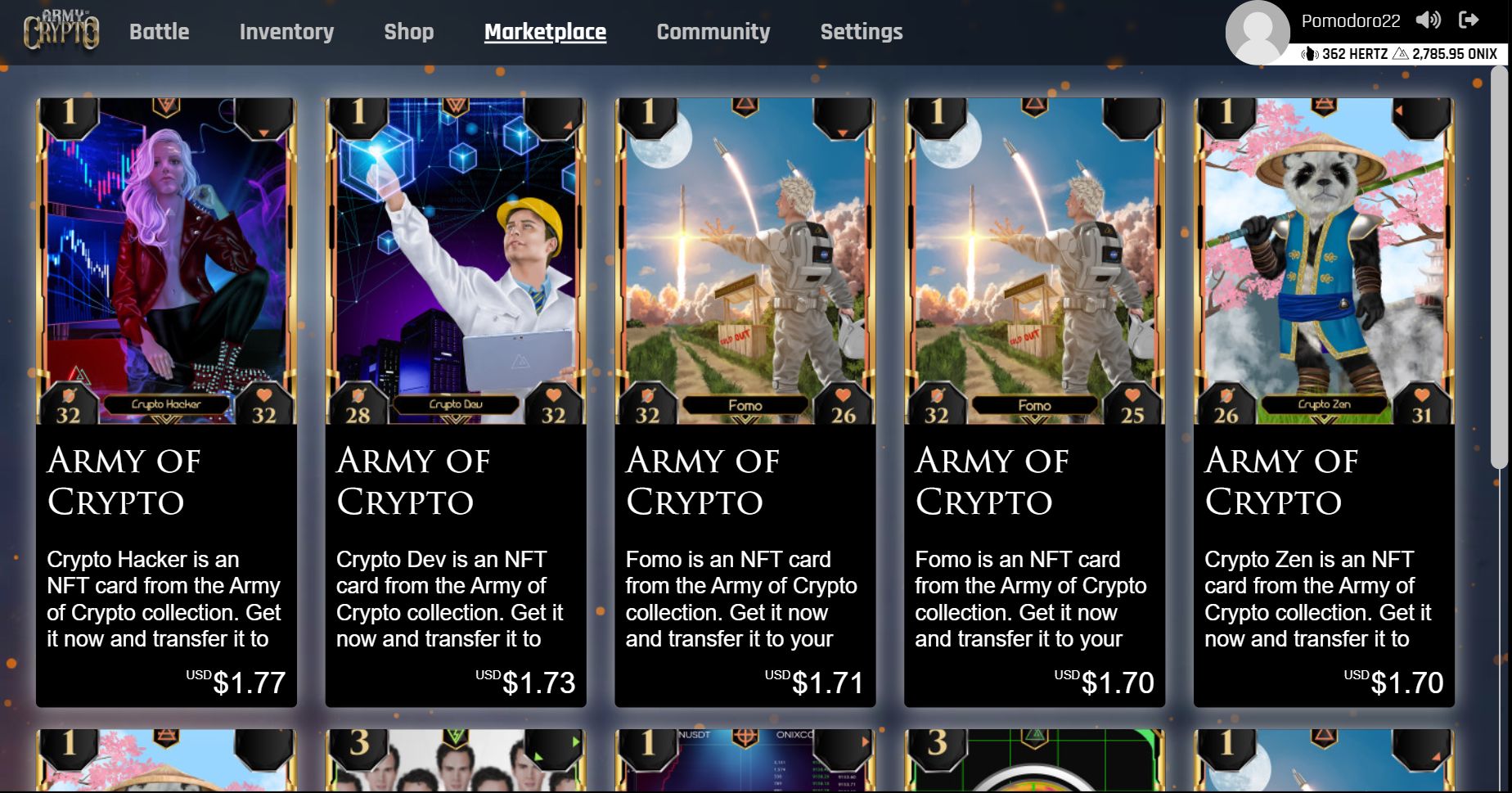 We integrated the Onix marketplace in our game, so users can see the cards put for sale there. We also provided a link to the website, so cards can be purchased and moved into your inventory from the Onix website.
