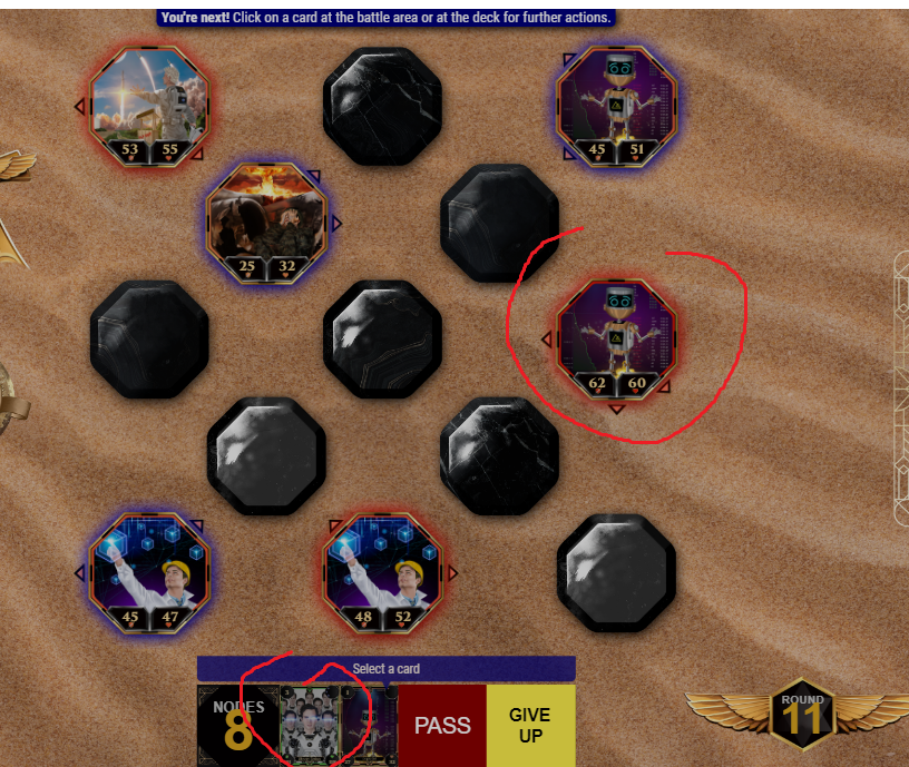 as you can see on the images attached, I encircled them. I placed my card(Altcoin Dailee) on the middle right part of the field. I got a visual bug at first where that card is only in idle(sleeping) mode. after I refresh the game, instead of my card showing there, it's my opponent's.