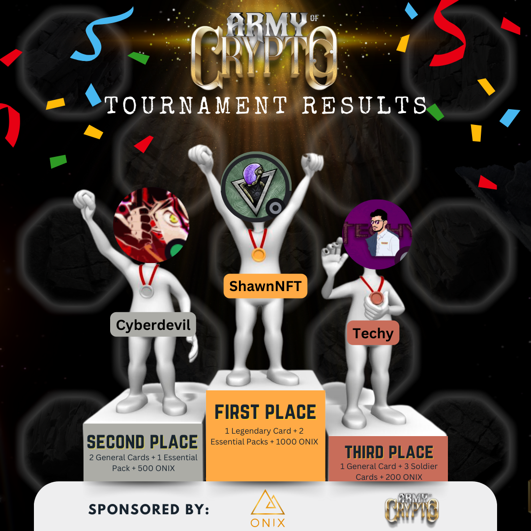 Thanks again to everyone who participated in the tournament and made it a success. We'll be looking out for you in the 2nd official tournament held by the Army of Crypto team.